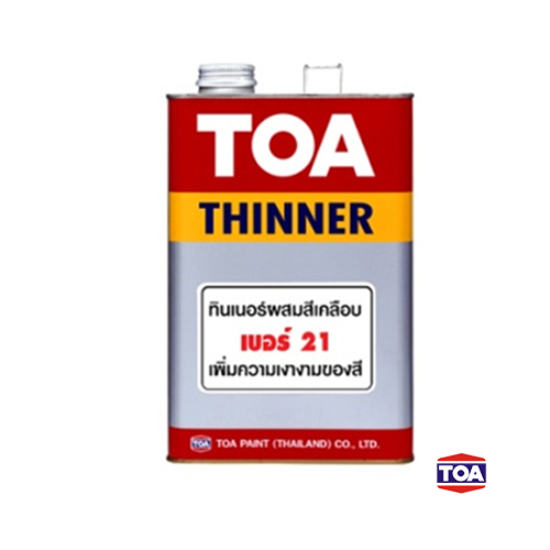 ทีโอเอ ทินเนอร์ เบอร์ 21 ผลิตจากตัวทำละลายอินทรีย์แบบผสม ใช้สำหรับเจือจางสีย้อมไม้และสีเคลือบเงาแอลคีด ช่วยให้สีซึมลึกเข้าสู่เนื้อไม้ได้ดีเยี่ยม เพิ่มการยึดเกาะ ทำให้ฟิล์มเรียบ และมีความเงาสูง